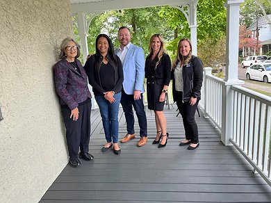 North Wales Mayor Neil McDevitt, Co-Executive Director of Laurel House Beth Sturman, Laurel House Board Co-Presidents Jason Van Buskirk and Melissa Pilong, and Co-Executive Director of Laurel House Stacy Dougherty pose outside a newly refurbished home in North Wales. (Photo courtesy of Laurel House)
