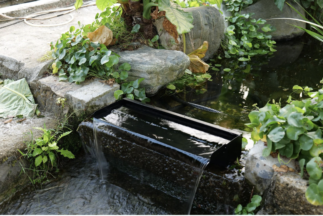 Poposoap solar pond filter. This filter helps maintain water clarity, ensuring that your waterfall and pond remain fresh and beautiful year-round.