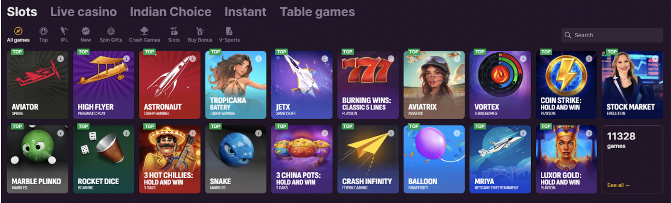 - Casino Game Selection: Indian players can typically expect a large library featuring thousands of games (reportedly 11,000+ in some cases). This often includes a vast number of slots with different themes, classic table games like poker, blackjack, baccarat, sic bo, and roulette, plus a live casino section for interactive play with real dealers.