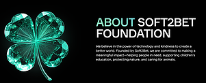 Soft2Bet Foundation promotional banner featuring a crystal green four-leaf clover and mission statement about using technology and kindness to support education, nature, and animal welfare