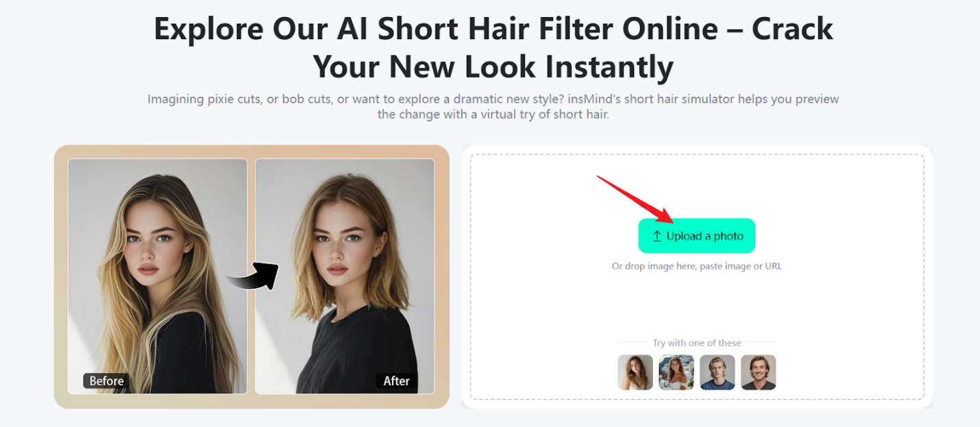 You can test new hair looks using an online short hair filter, such as that of insMind, which allows you to see the new style in real-time. All you have to do is take a picture and select your most preferred style.