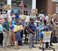 Montgomery County commissioner Jamila Winder, at podium, speaks at a rally in favor of SEPTA funding in North Wales on Tuesday, Aug. 26, 2025. (Dan Sokil – MediaNews Group)