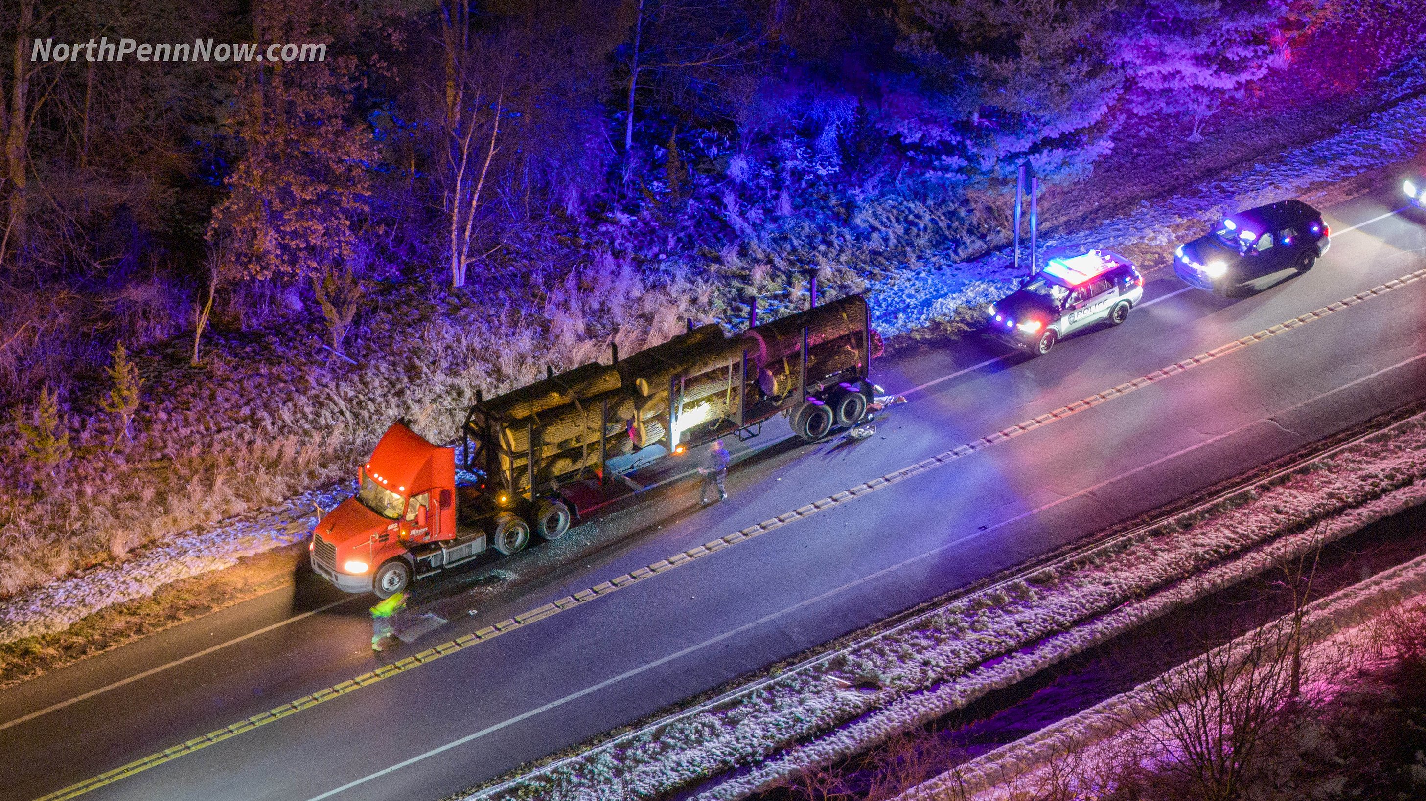 The logging truck is blocking the southbound lane, with vehicle debris behind it. A second vehicle, a white SUV, is pulled over to the side of the Parkway nearby.