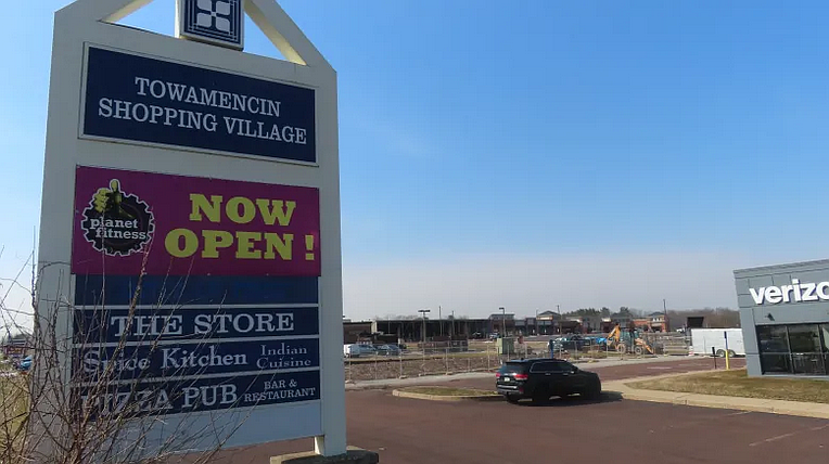 At Forty Foot and Allentown Roads, PSDC has proposed plans to revive the former Towamencin Village Shopping Center since the early 2010s, with an entertainment lifestyle overlay district approved in 2016 amid promises of new tenants that at times have included Whole Foods inside a former grocery space, a new Target behind the center, new tenants including Harbor Freight, and a new building housing a Chipotle restaurant and Mattress Warehouse shop on a pad site adjacent to the center.