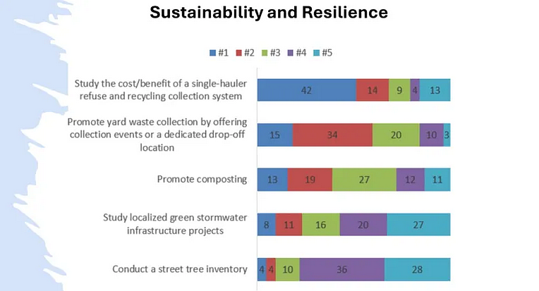 And for the sustainability and resilience category, the top ranked suggestion will draw debate: “Study the cost/benefit of a single hauler refuse and recycling collection system” was ranked a top priority by more than half of those who responded, followed by promoting yard waste collection, promoting composting, studying local stormwater infrastructure projects, and conducting a street tree inventory — similar to a survey done in one of the town’s three wards by a local Eagle Scout last year — from top to lowest priority.