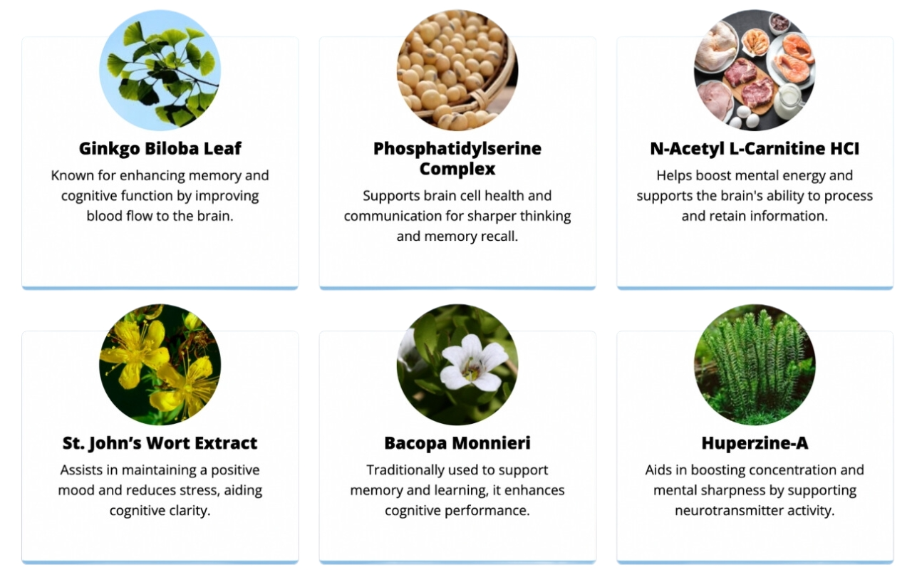 Key ingredients include Ginkgo Biloba, Phosphatidylserine, N-Acetyl L-Carnitine, St. John’s Wort, Bacopa Monnieri, and Huperzine-A, each contributing to cognitive enhancement and memory support.