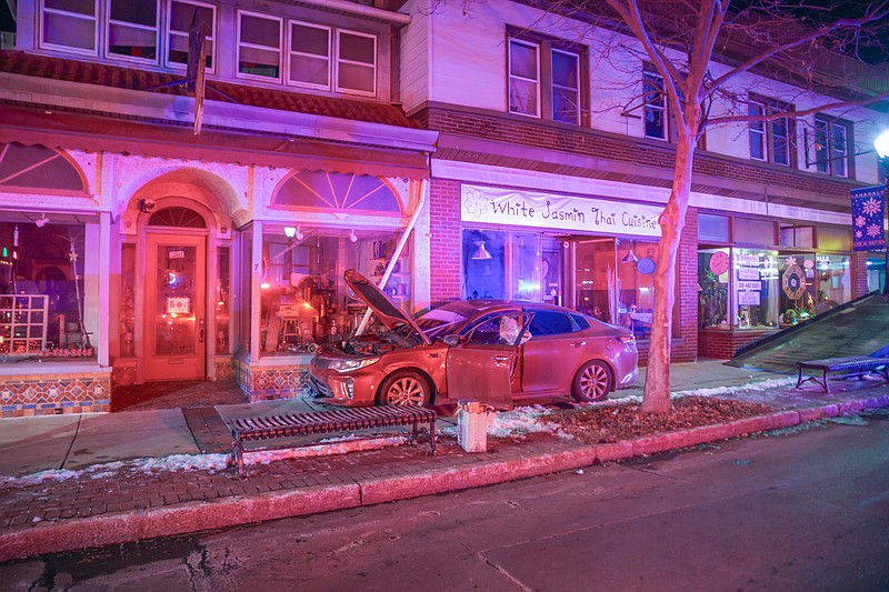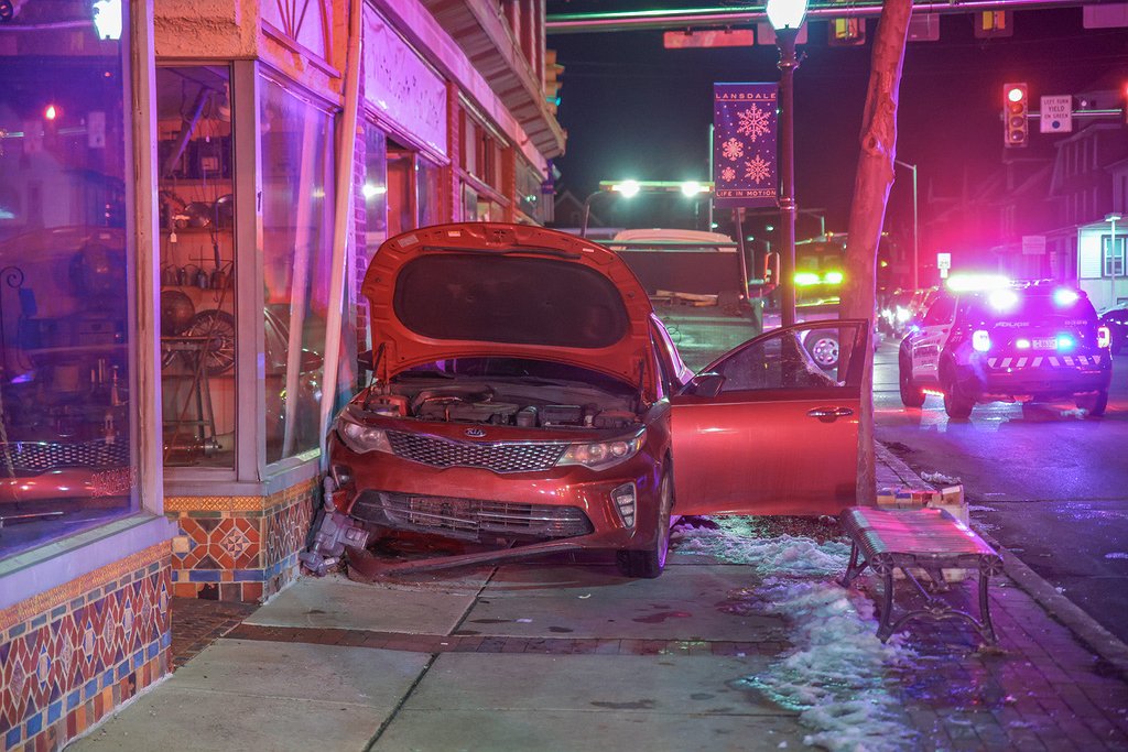 A red Kia sedan narrowly avoided colliding with cars in at the Broad and Main street intersection in Lansdale Borough Monday night, before driving up onto the curb and sidewalk and crashing into a gas meter in between White Jasmin Thai Cuisine at 5 W. Main St. and Nostalgic Collectibles, avoiding any major damage to the business or building.