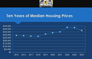 During the supervisors meeting on Wednesday night, Leavitt-Gruberger showed a series of slides outlining facts and figures about the township so far, including a chart of median housing prices starting in 2015, when the median price was just under $30,000; a slight downward trend through 2019, then a steady climb to just short of $450,000 in 2022 before falling the following two years.