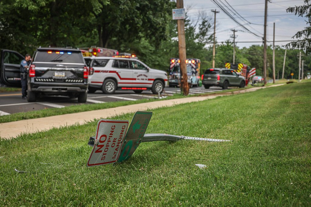 At least two street signs were demolished in the crash, and a utility pole sustained damage near its base.