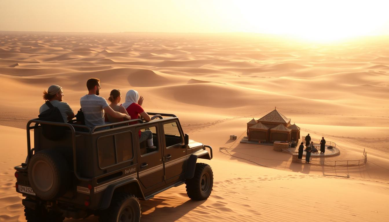 Imagine the thrill as you start a sunrise desert safari Dubai in a high-powered dune buggy. You cruise through the desert dunes as the sun rises. This adventure mixes excitement with stunning views at dawn.