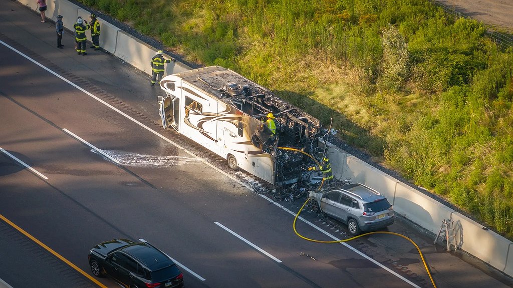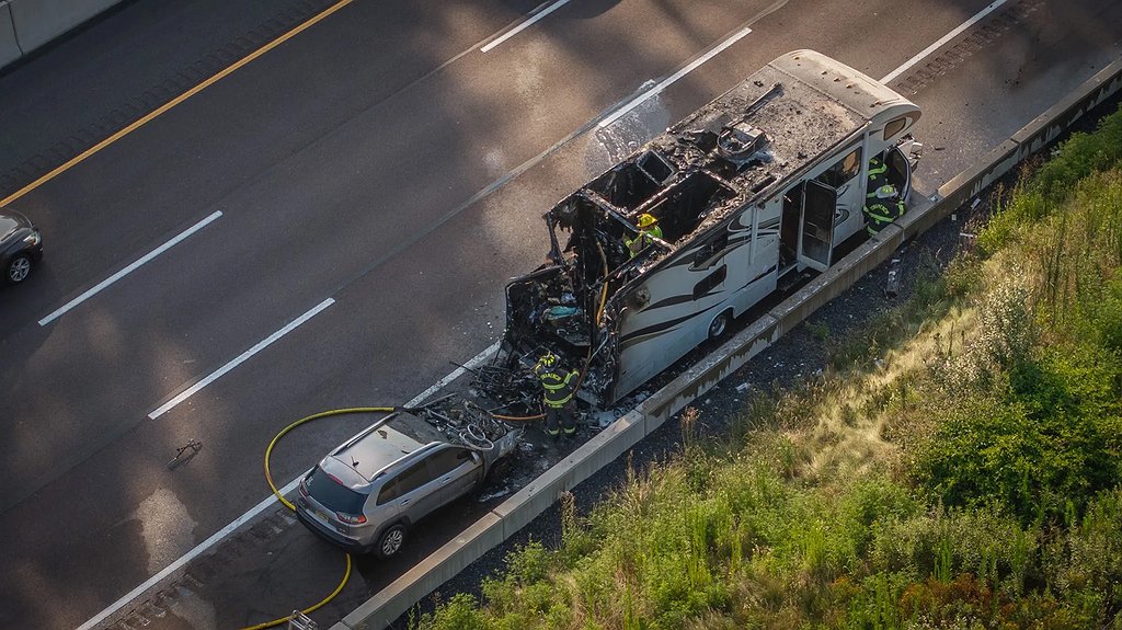 Witnesses said that the incident involved a fully engulfed recreational vehicle (RV), which was towing another vehicle. Those at the scene reported that the occupants were out of the involved vehicles and the units were pulled to the side of the road.