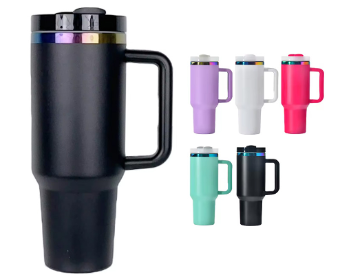 One of the most sought-after items in the Crafix catalog is the 40oz powder coated travel mugs with rainbow-plated rims. These tumblers are nothing short of stunning. Here’s why: