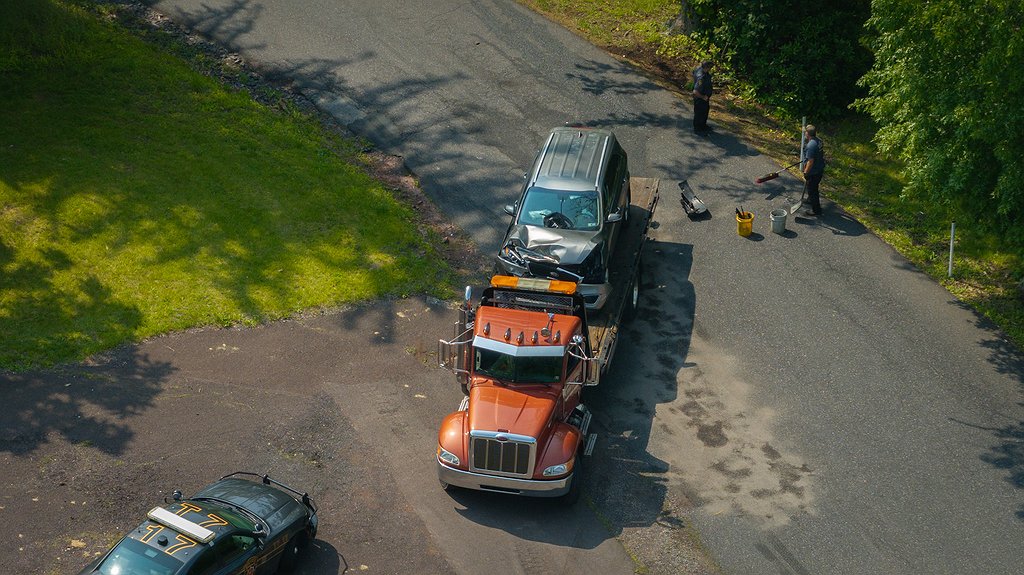 An SUV with severe front-end damage was towed from the scene.