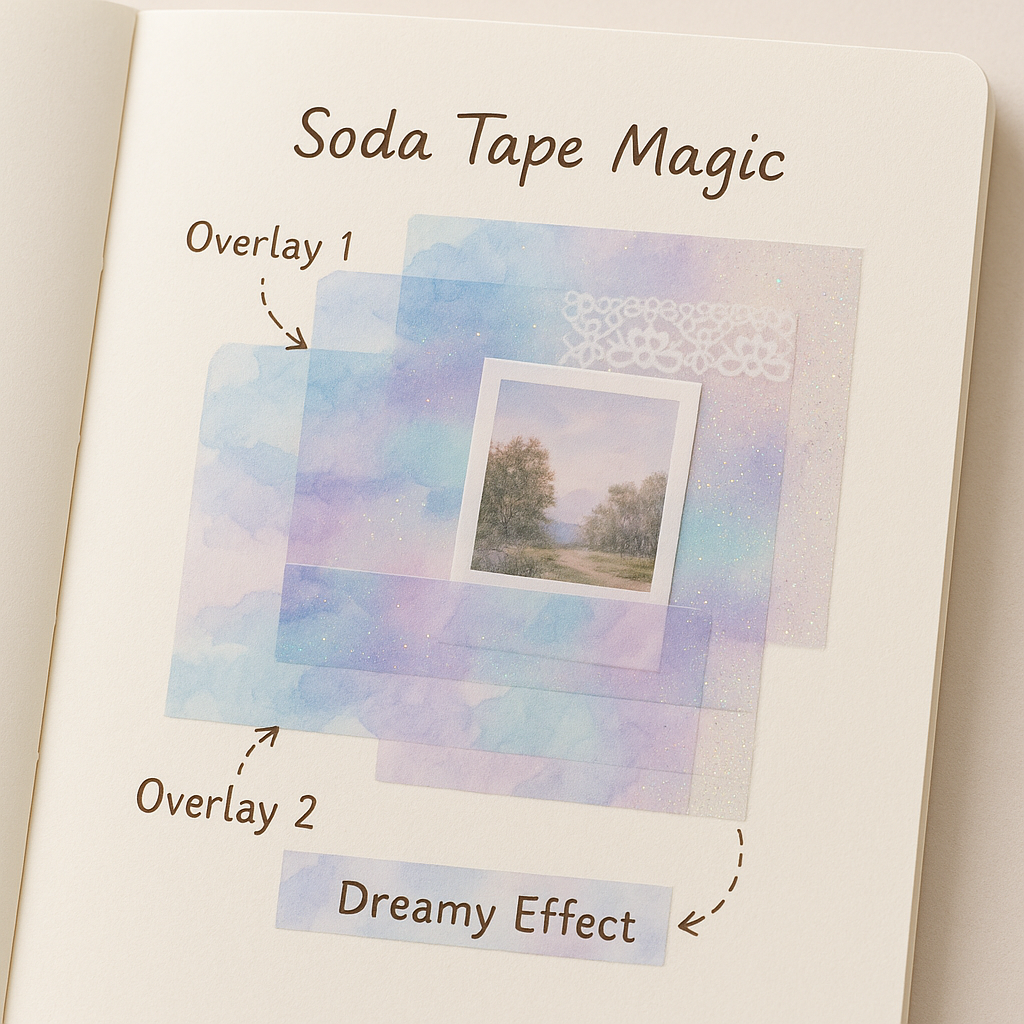 Try framing a cherished photo with transparent Soda tape for a gentle, dreamy effect, or layer different textures and patterns for intricate collages. Whether you’re new to crafting or a seasoned journaler, Soda offers endless possibilities to bring your pages to life.