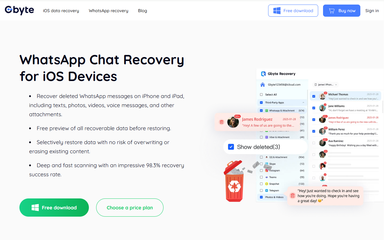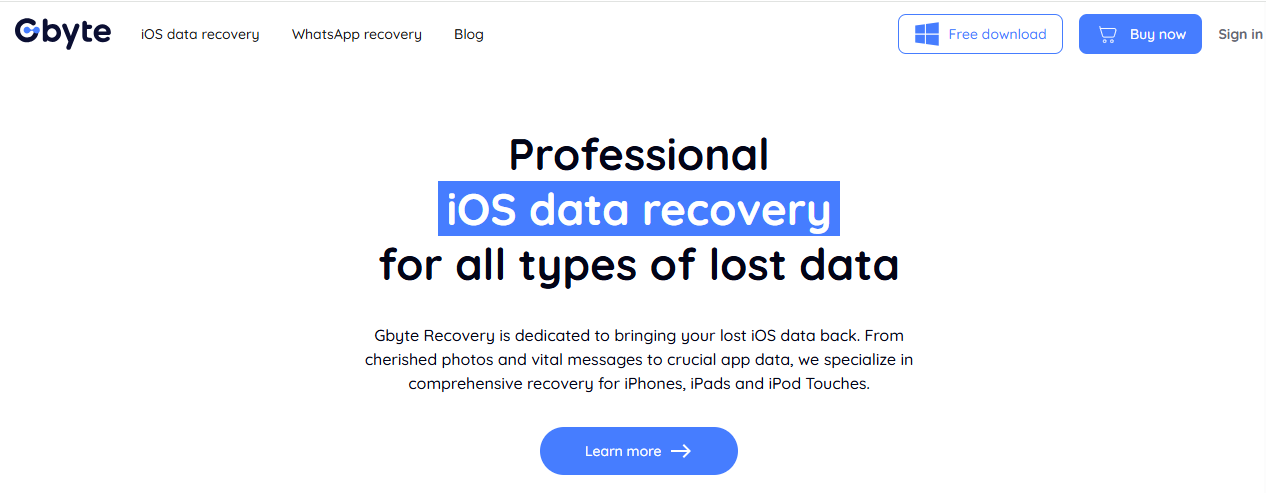 Gbyte is a data recovery tool that lets users recover deleted data from iOS-running devices. Featuring advanced data recovery technology, the software boasts a high success rate regardless of the scenario. Unlike many tools, Gbyte can recover lost or deleted data without a USB cable. Its iCloud scanning capability allows it to retrieve WhatsApp messages from damaged devices. Additionally, the software is known for its user-friendly interface and high security level.