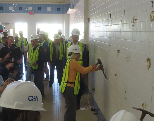 The longtime legend was the first of dozens of dignitaries who took a drill or a hammer to the natatorium’s walls, in a “tile breaking” ceremony to mark the start of long-awaited renovations to the high school.