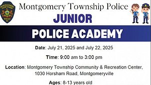Montgomery Township Police invites local youth to join the 2025 Junior Police Academy. This free program, open to children ages eight to 13, will be held on July 21 and July 22, from 9 a.m. to 3 p.m. at the Montgomery Township Community & Recreation Center, 1030 Horsham Road in Montgomery Township (GPS: Montgomeryville).