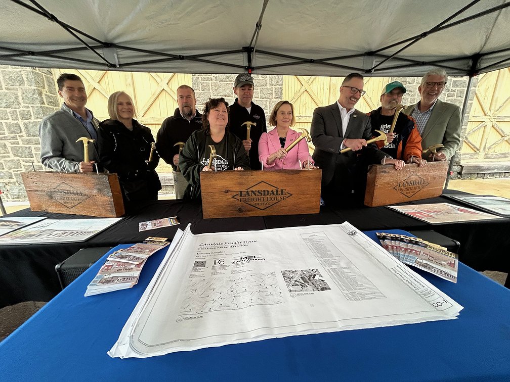 Discover Lansdale and borough visionaries hammer nails into old timber during the Lansdale Freight House groundbreaking May 22, 2025. From left are Ken Seiler of Ring Consulting Group, Helen Harlow Schwartz of Discover Lansdale, Lansdale Borough Public Works Director and Director of Community Development Jason Van Dame, Lansdale Borough President and Discover Lansdale Vice President Mary Fuller, Discover Lansdale President Bill Henning, State Sen. Maria Collett, State Rep. Steve Malagari, Discover Lansdale Secretary Bruce Schwartz, and Lansdale Borough Manager John Ernst.“Standing here, is not just stone and mortar and timber, but a story— it’s a story of hard work, it’s a story of history, and now a hope for our future,” said Malagari, a hometown son who once toyed with opening a brew pub at the location many years ago. “The Lansdale Freight House once pulsed with energy of industry and lifeblood of Montgomery County and for decades it sat silent, a faded reminder of our past.”