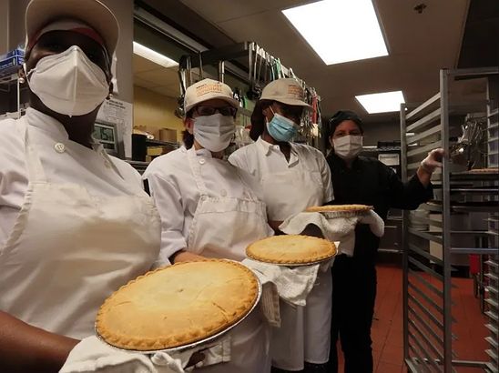 Manna on Main Street Common Grounds program trainees Victoria Cox, Jennifer Selfinger, and Marissa Pooler, left to right, hold pies prepared for a Thanksgiving meal distribution with help from Manna Safety and Production Manager Lisa Divincenzo, at rear, on Tuesday Nov. 23 2021.Council candidate Melanie Catanese said she had read statistics indicating that over 60,000 residents in Montgomery County are recipients of SNAP benefits, out of over 100,000 who are eligible, and about 30 percent of the students at North Wales Elementary School are eligible for free or reduced-price lunches.