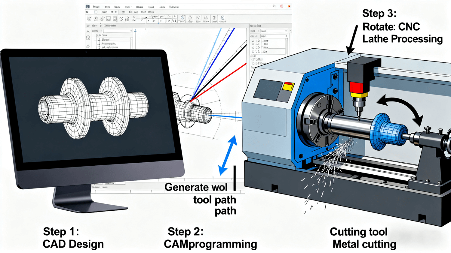 Alt Text: Diagram illustrating the 3-step CNC turning workflow: CAD design, CAM programming, and CNC machining on a lathe