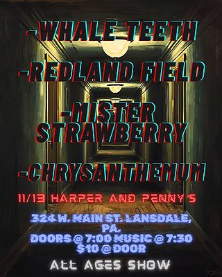 Thursday’s show features Midwest emo aficionados Redland Field, returning to Harper & Penny’s after playing there for the first time last month. Also returning from Philly after their first show last month is Whale Teeth. Coming all the way from Pittsburgh, Mister Strawberry will be stopping through on their way to Jersey the next day. Chrysanthemum will be opening the show with doors opening at 7.