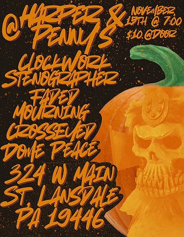 Saturday night marks the return of local favorites Clockwork Stenographer and Crosseyed, bringing their sad and heavy grooves back to Wood street for the masses. Joining them on the lineup is Faded Mourning and Dome Peace. Both of these bands have yet to play Harper & Penny’s, hopefully this night gives the same bounty that virtually all shows around here seem to see.