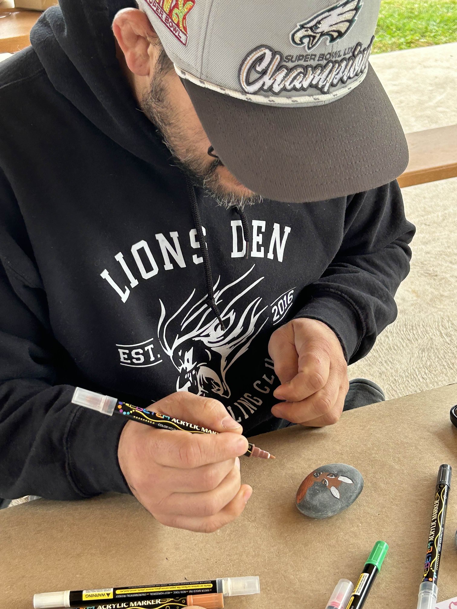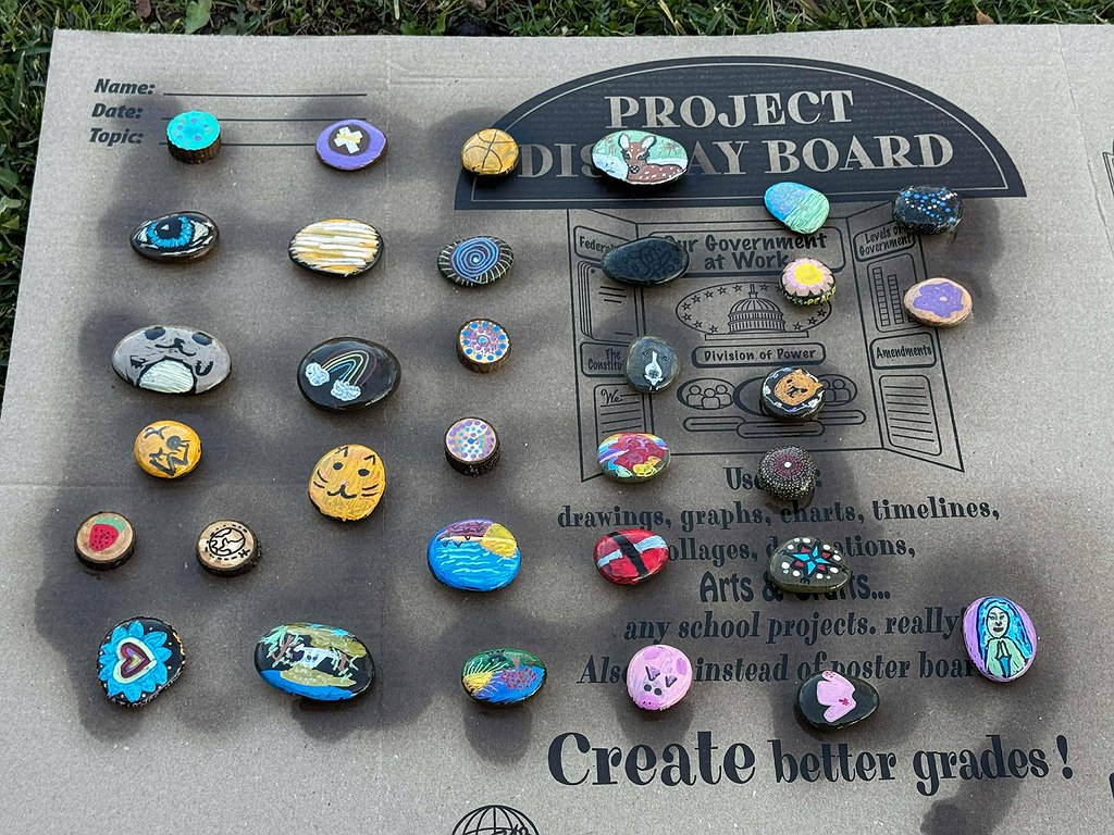 All three separate little library boxes stand in a mulched rock garden, where visitors can leave painted rocks in memory of Charlie or other beloved pets.
