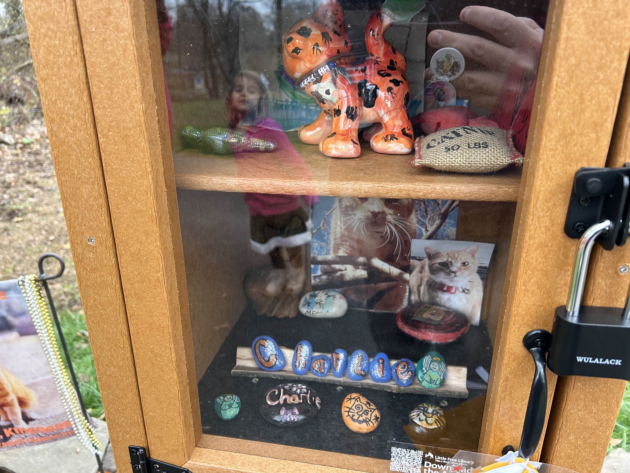 Charlie’s Corner includes three community sharing libraries with children’s books, general reading for high schoolers and adults, and Charlie memorabilia, with rotating items originally left at his memorial stump over the last year.