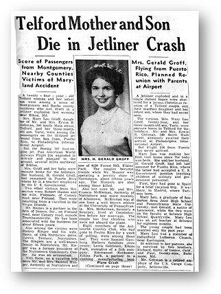 Two of them were Mary Lou (Gehman) Groff of Telford and her infant son, Taric. She was returning home for the holidays from Puerto Rico where her husband, Gerald, was a U.S. Government-employed teacher. Her story appears in the attached Reporter clipping.