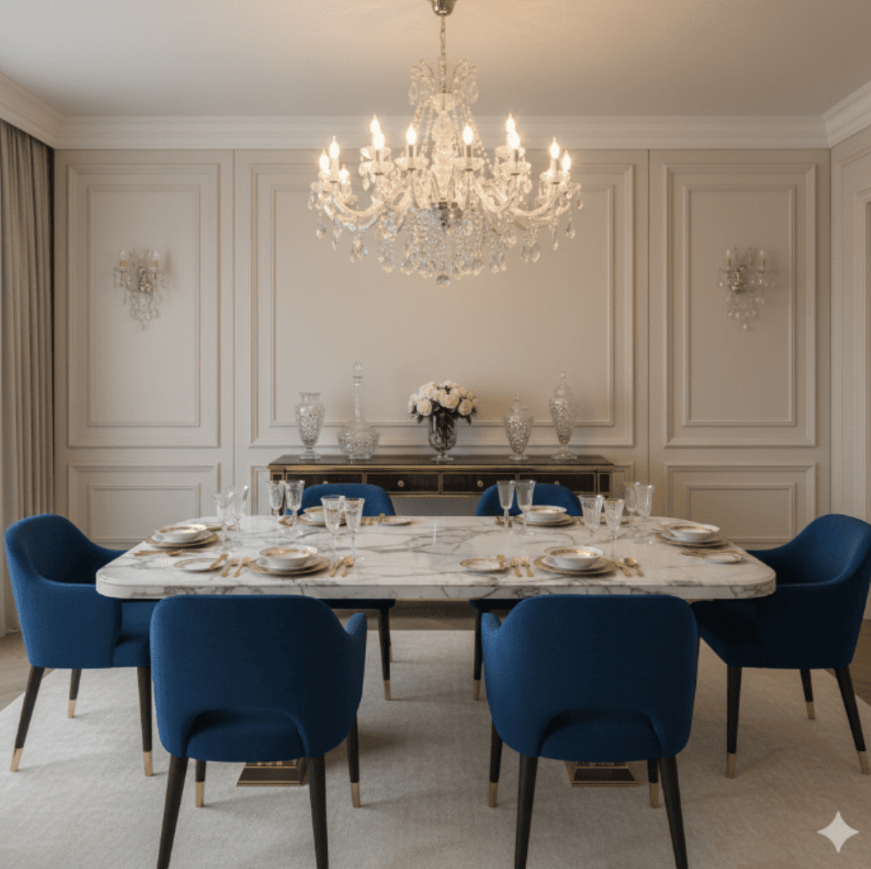 For those aiming for a complete royal house style, the chandeliers and gold accumulate the wealth of velvet. This combination makes food a wonderful experience - every dinner feels like a party that fits royal. In the interior design, Velvet plays a double role: It is both a statement and a comfort element, making your dining room a place where luxury comes from.