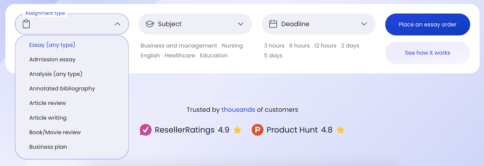 Ordering is straightforward. Even students new to online essay writers should have no trouble submitting instructions and picking options.