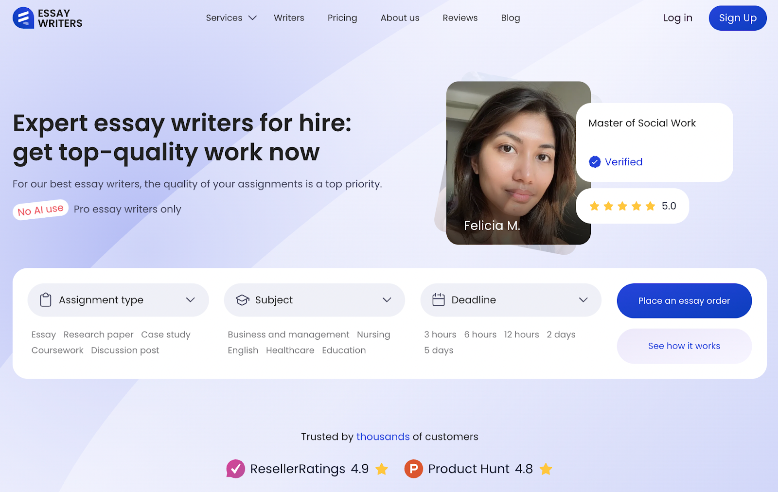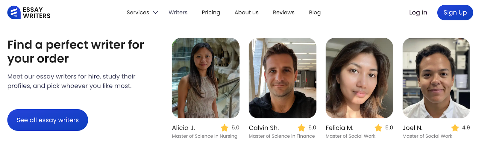 The site claims to have more than 400 professional essay writers on hand. Many of them hold advanced degrees and list subject-specific knowledge.