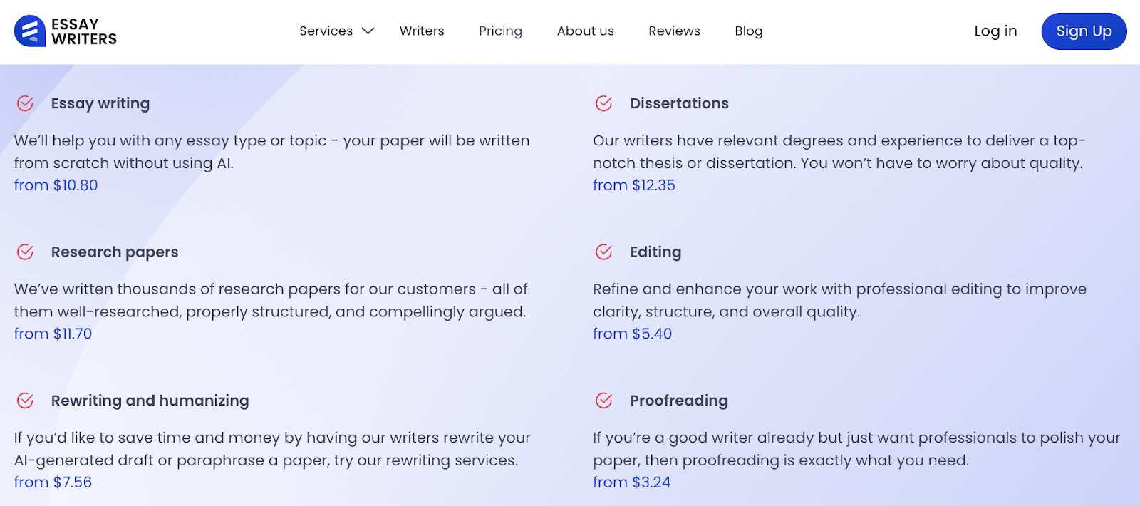 Professional college essay writers aren’t limited to just essays. The platform lists a wide mix of assignments: research papers, case studies, reports, and even dissertations. Editing, proofreading, and rewriting are also available.