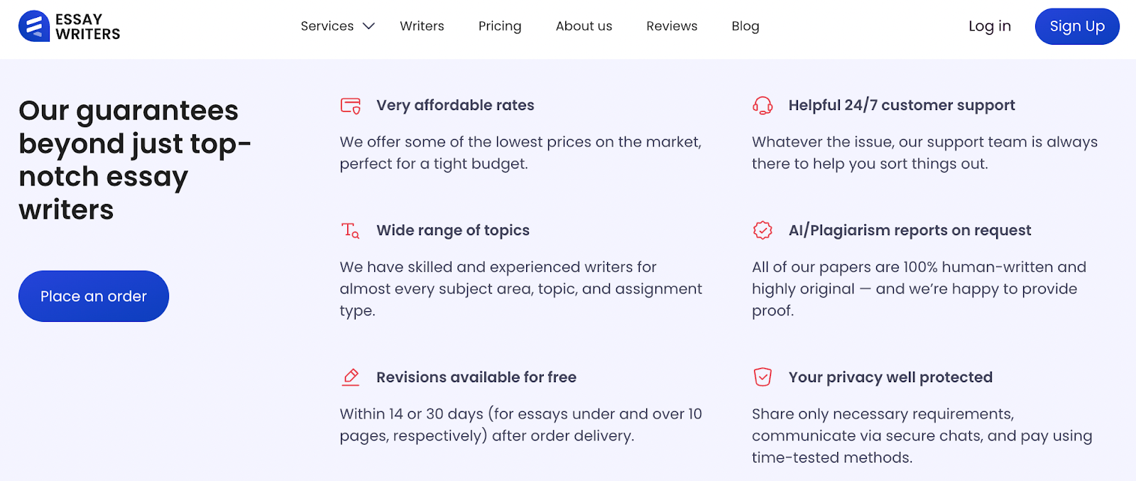 As mentioned in essaywriters review, these policies suggest the company understands the main concerns students have when using essay writing services.