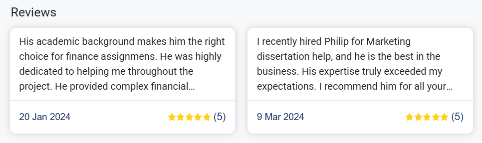 What truly distinguished them was the assistance I received during my final dissertation defence and presentation. Their experts assisted with refining slides, summarising complex sections and formulating confident answers. I must say that preparation made all the difference as I felt calm, clear, and fully prepared to defend my research successfully.