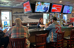 The billiards room has been replaced with a gleaming dining room, outfitted with multiple hand painted murals. Around the corner sits a full bar with several high-top tables against the backdrop of a sizable Hatfield Speedway painting, an homage to the old Hatfield racetrack.