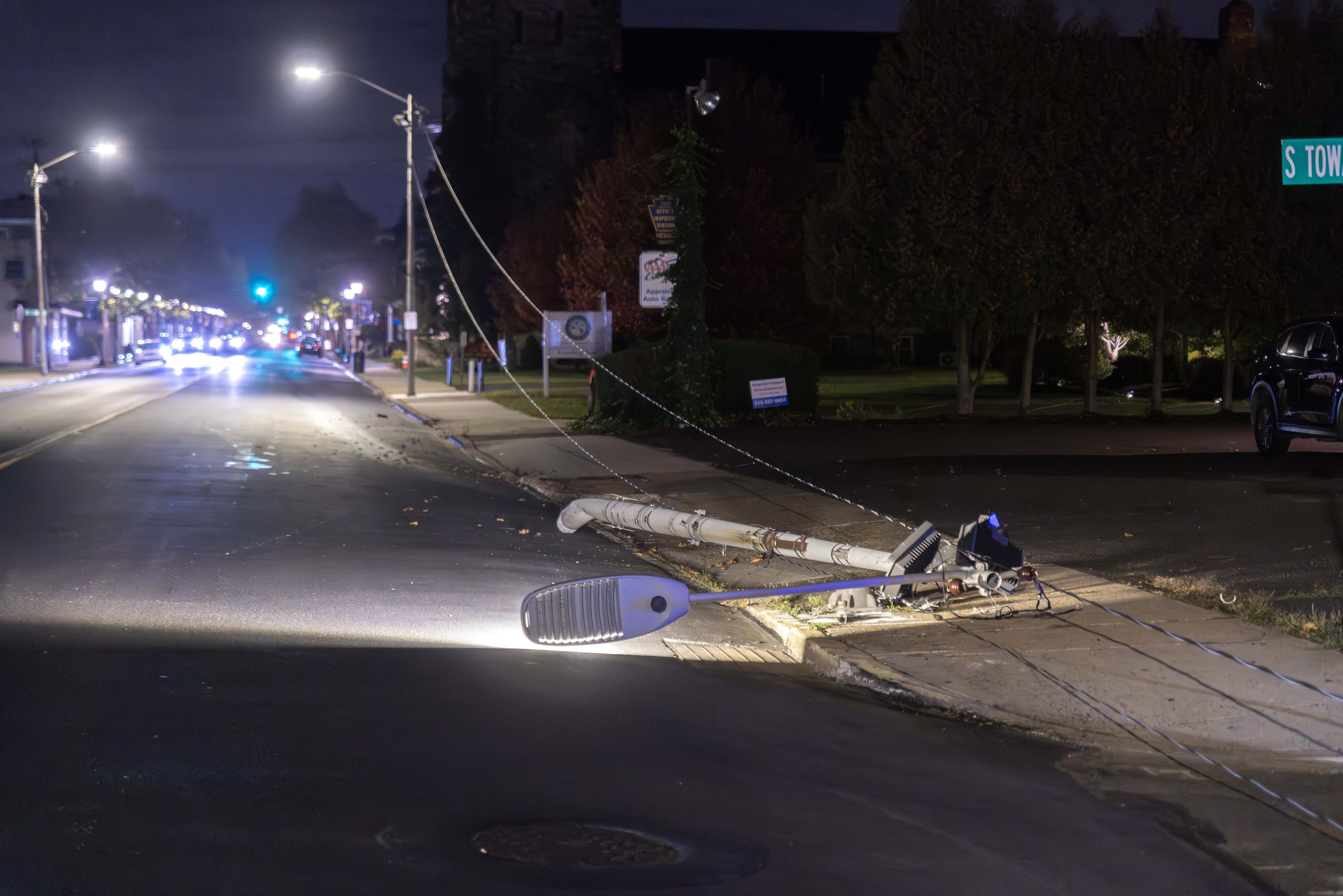 The driver of a black Cadillac SUV hit a light pole on Main Street at South Towamencin Avenue in Lansdale Borough late Saturday night, eventually being detained by police on Susquehanna Avenue.