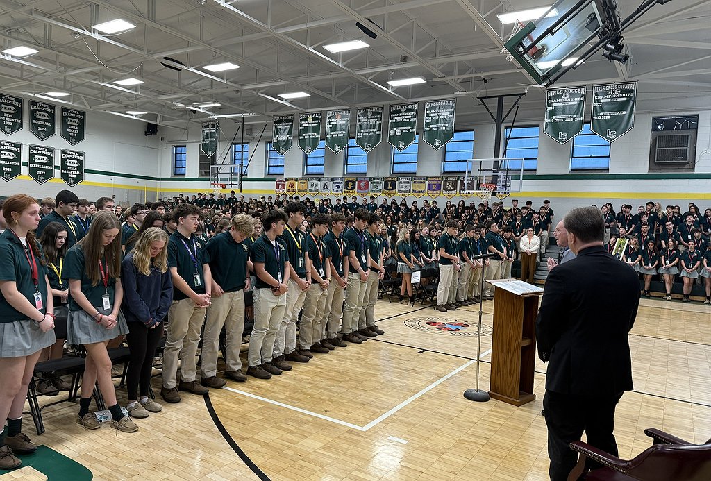 On Monday, the LC community gathered in the school gymnasium for a prayer service led by Bishop Chylinski, Father Chung of St. Maria Goretti, and Father Taglianetti, the school’s chaplain, to honor John’s life and comfort his classmates.