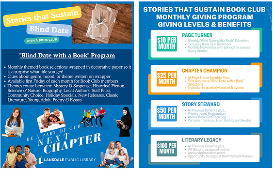 The “Stories that Sustain” Book Club also includes a monthly giving program with donation levels of $10, $25, $50, or $100 per month, offering participants the chance to support ongoing library programs while engaging in themed literary experiences.