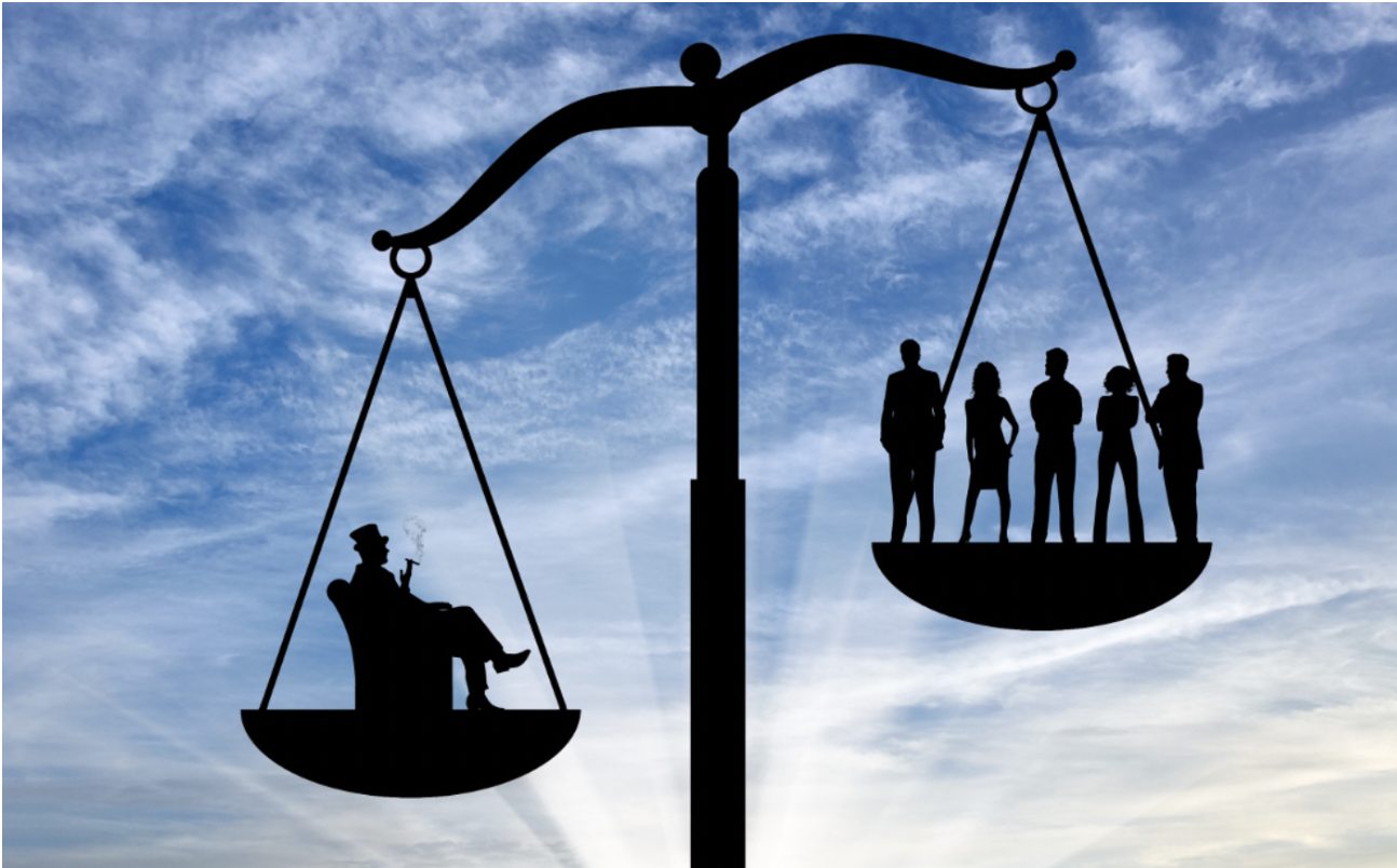 Figure. Wealth inequality: one wealthy individual outweighs an entire group on the scales of justice.