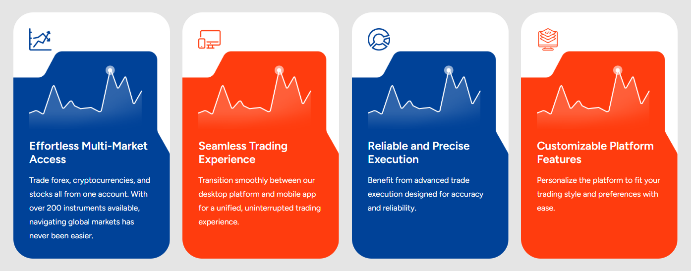 The platform provides access to over 300 instruments across multiple asset classes. Traders can explore forex markets with leverage of up to 500:1, trade major indices like the S&P 500 and Dow Jones, invest in precious metals such as gold and silver, or engage with cryptocurrencies available 24/5.