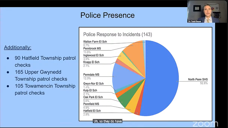 North Penn High School had the most police response incidents at 52.8%, followed by Penndale at 12%, Pennbrook at 10.6%, and Oak Park Elementary School at 5.6%.