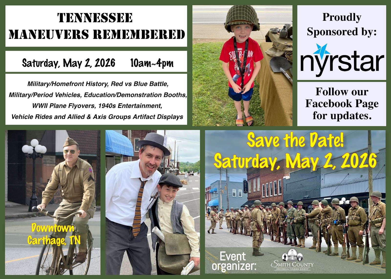 Mark your calendars and register now for Tennessee Maneuvers Remembered! Downtown Carthage will step back in time on Saturday, May 2, 2026, as the Smith County Historical Tourism Society hosts their sixth living history event.