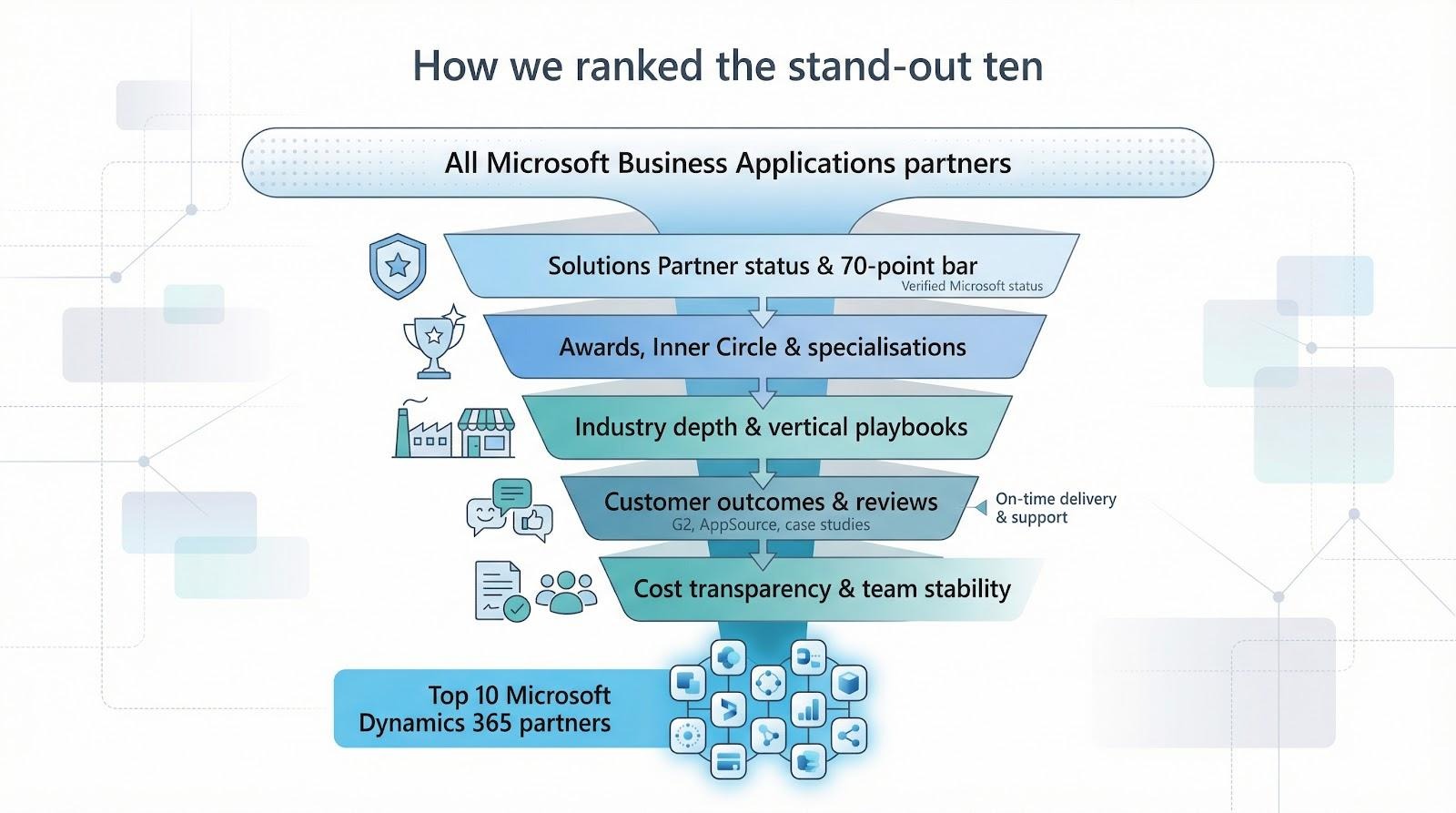 First, we verified each firm's current Microsoft status. Only partners that hold the new Solutions Partner for Business Applications badge, or that exceed its 70-point bar for performance, skills, and customer success, made the cut. Microsoft introduced this designation in 2022 to replace the old Gold/Silver labels and raise the bar for quality.