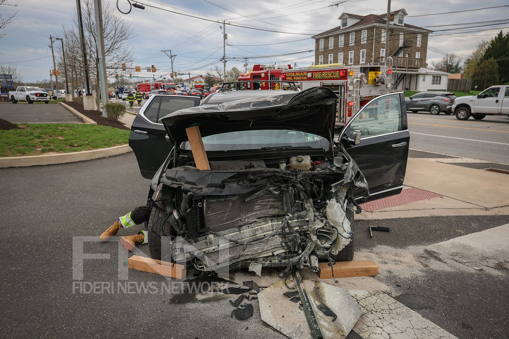 The crash, reported around 2:03 p.m., involved a black Chevrolet SUV and a white Kia Soul, both sustaining heavy front-end damage. The injured driver was behind the wheel of the Kia.