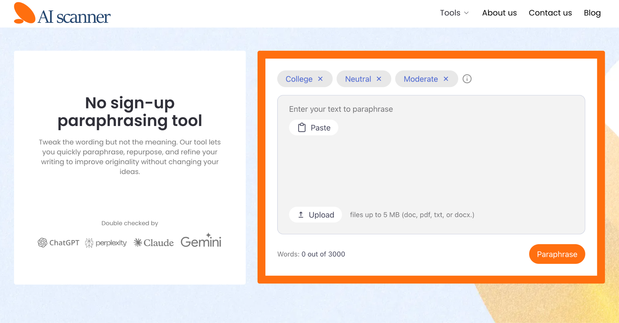 AI Scanner is the most customizable tool in this group, and that is its big advantage. You can paste, type, or upload text, then adjust academic level, style, and synonym level before paraphrasing. The listed academic levels run from high school to doctorate, and the style choices include Elaborate, Neutral, Formal, and Simple. That is more control than most users get on a free paraphraser page.