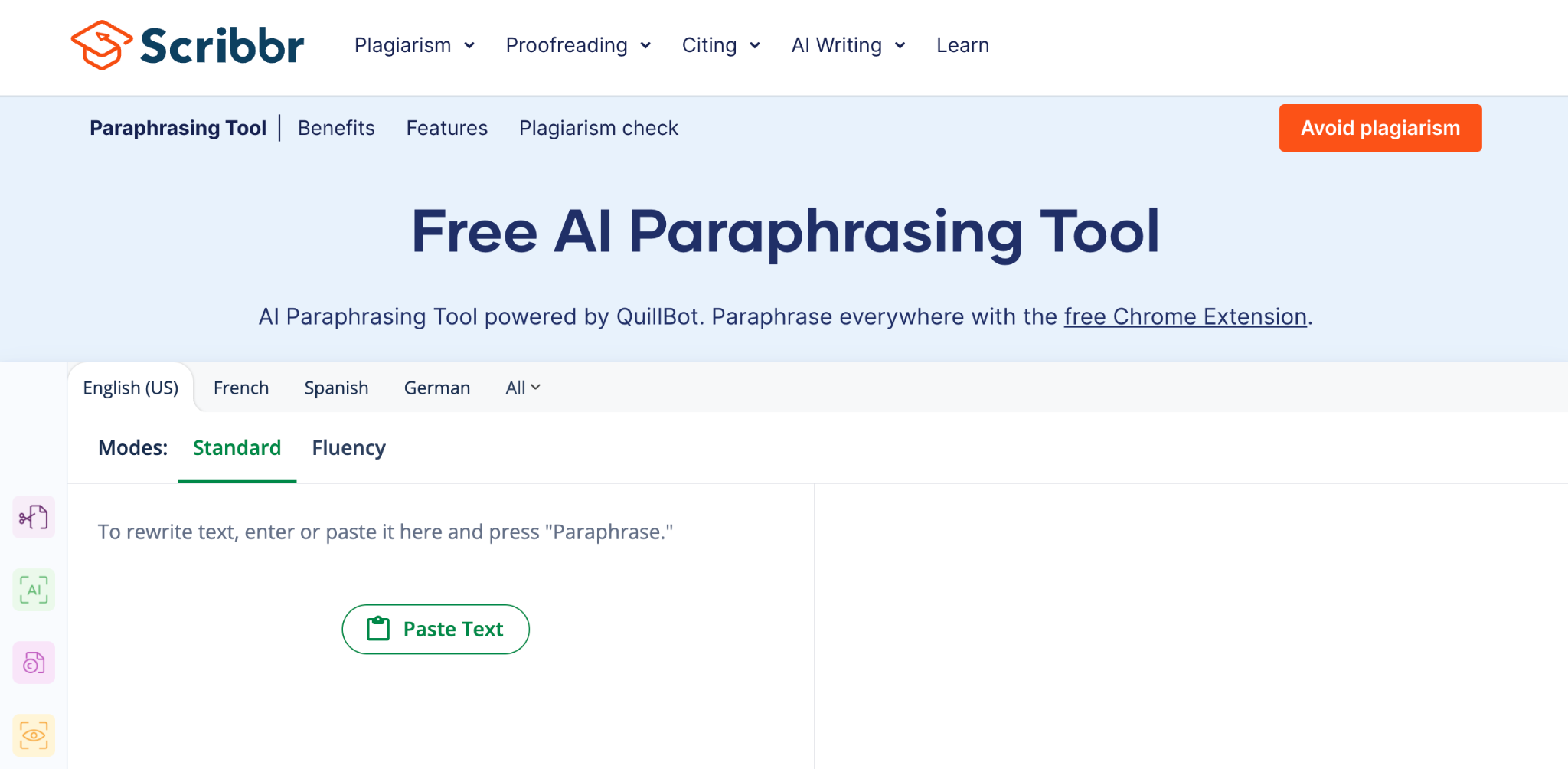 Scribbr’s paraphraser is powered by QuillBot, and it also offers a separate free AI Rewording Tool. That second tool adds concrete features that matter in real use: two rewrite modes called Standard and Fluency, document upload for Word, Google Docs, and PDF files, an interactive thesaurus, and export or copy options. Scribbr also says the rewording tool handles up to 125 words per paragraph and can be used without a login.