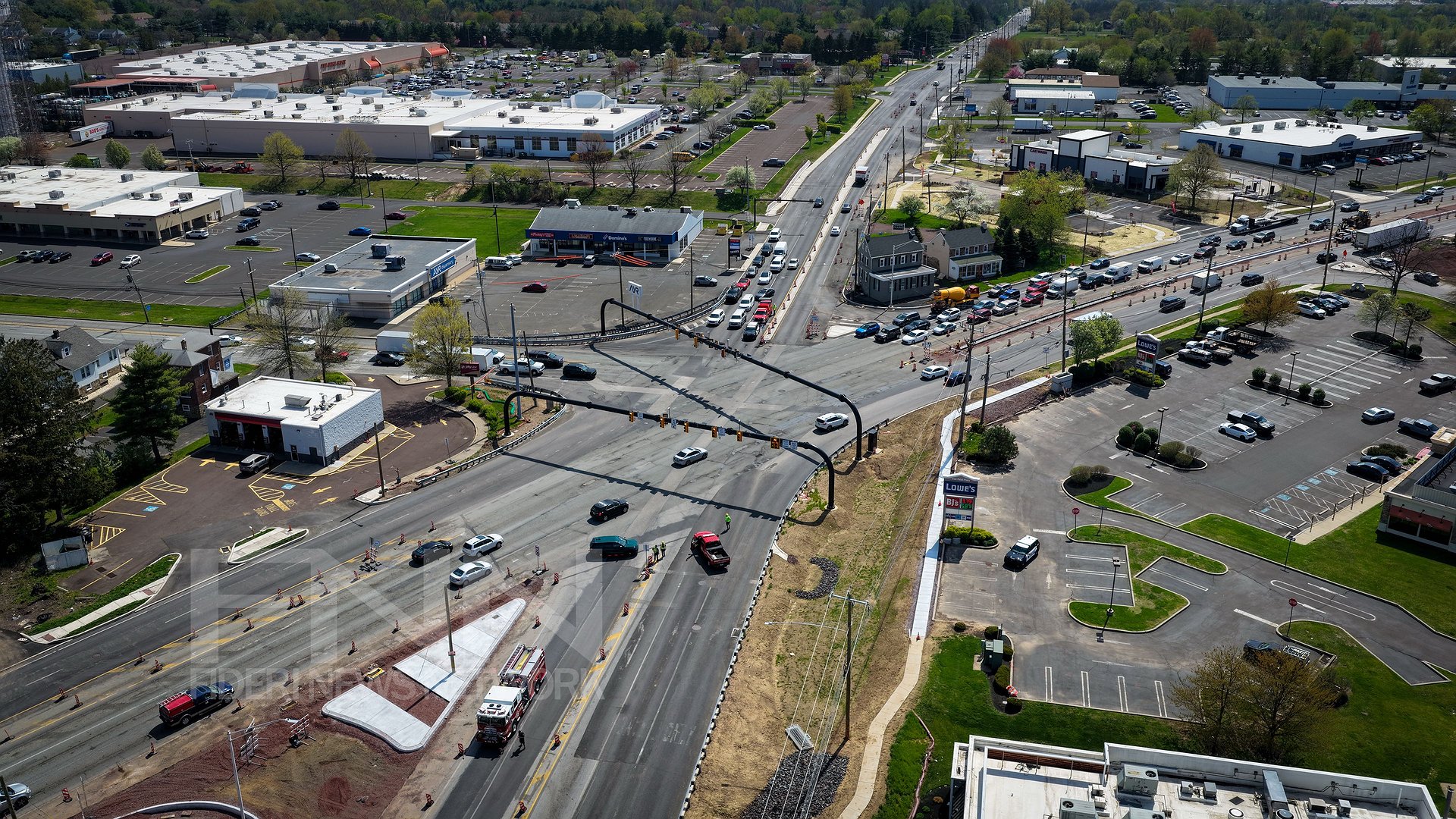 Authorities have closed Cowpath Road between Taylor Road and the Five Points intersection near the entrances to BJ’s and Lowe’s, with traffic being diverted around the area. Fire police are working to secure the scene and restrict access while crews assess the situation.
