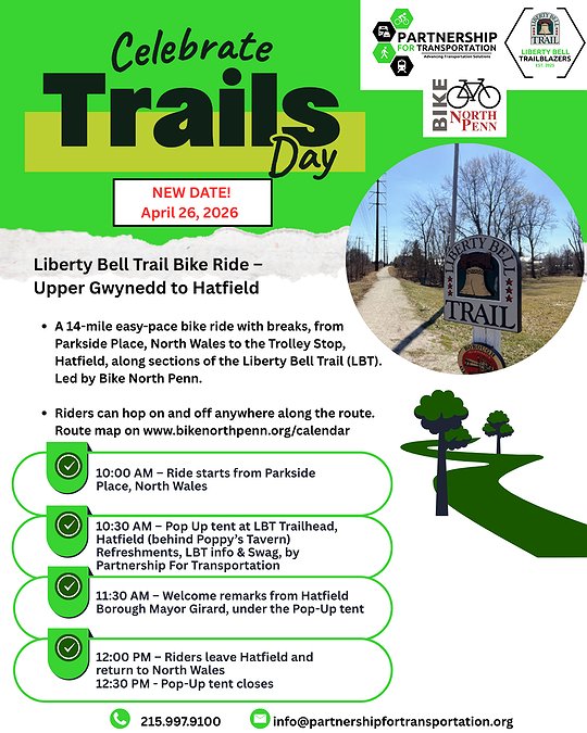 This year, Celebrate Trails Day will serve as a powerful call to action in Montgomery County, as the Partnership For Transportation and Bike North Penn invite residents to hit the trail and advocate for the completion of the Liberty Bell Trail.