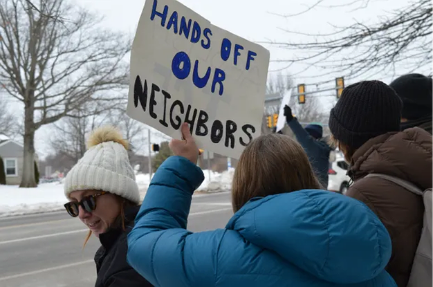 Across the street, area residents gathered on the sidewalk holding signs of their own as they stood in solidarity with the student demonstrators. “You guys are brave. You guys are strong,” someone shouted.